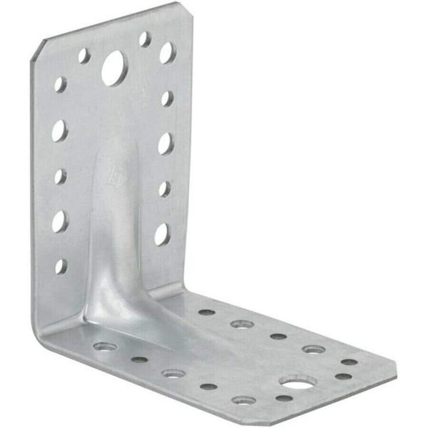 L-shaped fastener used to join two parts generally at a 90 degree angle. It is typically made of metal. The metallic angle brackets feature holes in them for screws. Its typical use is to join a wooden shelf to a wall or to join two furniture parts together.